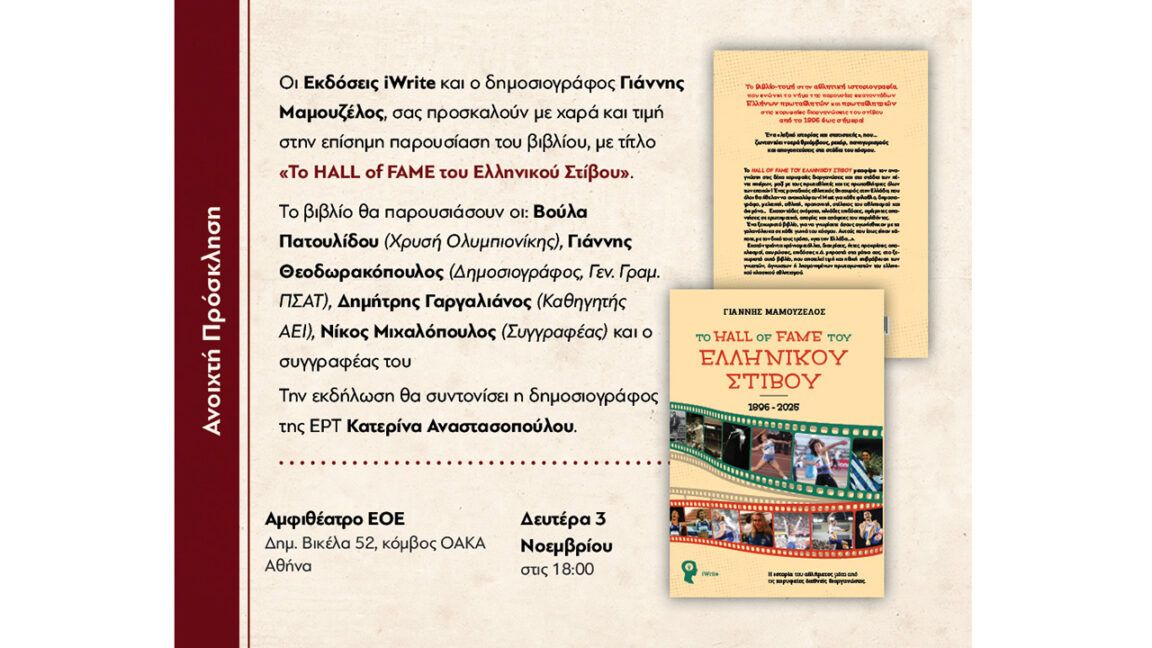 Ο δημοσιογράφος Γιάννης Μαμουζέλος θα παρουσιάσει την Δευτέρα 3 Νοεμβρίου το νέο του βιβλίο «Το HALL of FAME του Ελληνικού Στίβου» από τις εκδόσεις iWrite.