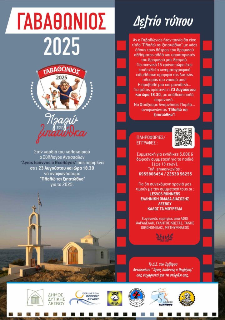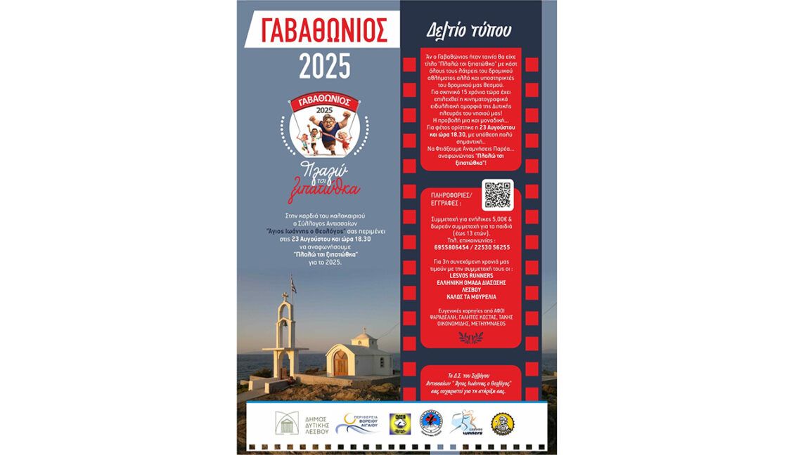 Το Σάββατο 23 Αυγούστου θα διεξαχθεί ο Γαβαθώνιος 2025 9χλμ. στη Λέσβο.