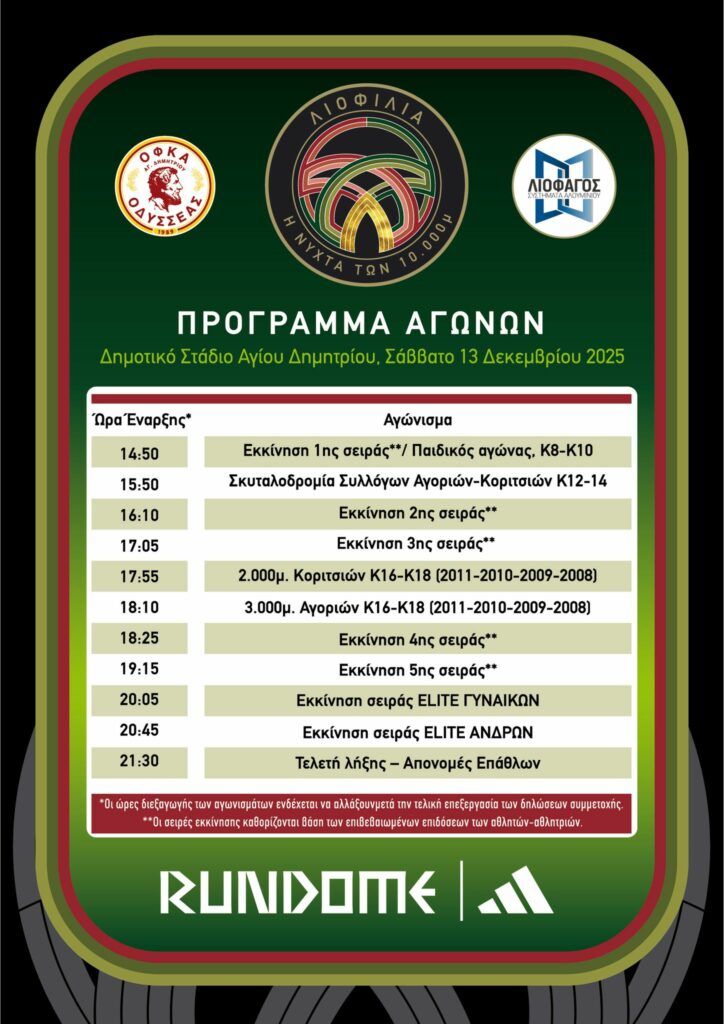 Τα «Λιοφίλια – Η Νύχτα των 10.000μ.» θα διεξαχθούν για μία ακόμα φορά το Σάββατο 13 Δεκεμβρίου 2025 στο Δημοτικό Στάδιο Αγίου Δημητρίου.