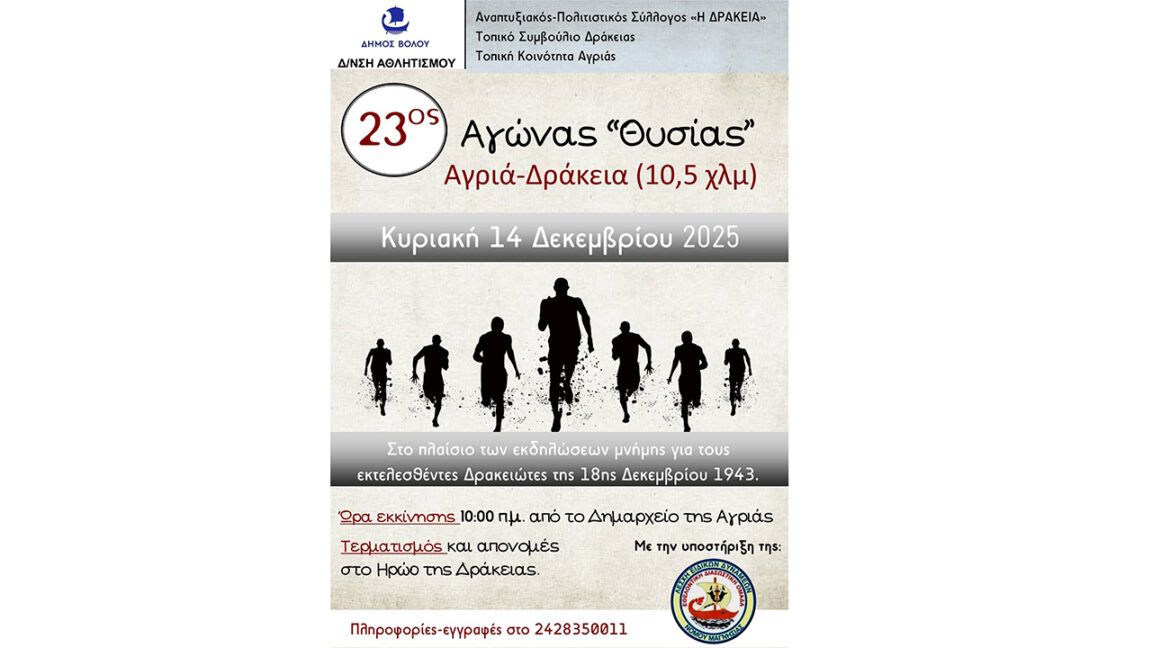 Την Κυριακή 14 Δεκεμβρίου θα πραγματοποιηθεί ο 23ος Αγώνας Θυσίας Αγριά-Δράκεια με απόσταση 10,5χλμ.
