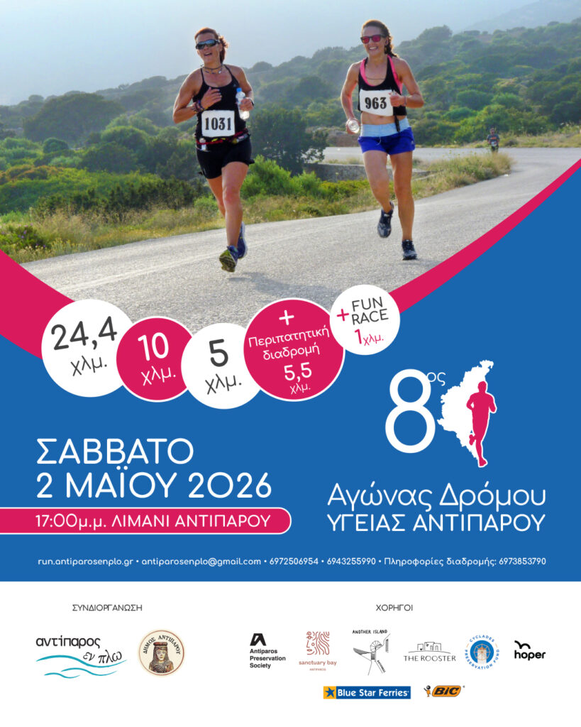Ο Πολιτιστικός σύλλογος «Αντίπαρος Εν Πλω» μετά από την ιδιαίτερα επιτυχημένη διοργάνωση 7 αγώνων δρόμου τα προηγούμενα χρόνια, επιστρέφει δυναμικά με τον 8ο Αγώνα Δρόμου Υγείας Αντιπάρου που θα διεξαχθεί το Σάββατο 2 Μαΐου 2026 στο νησί της Αντιπάρου.