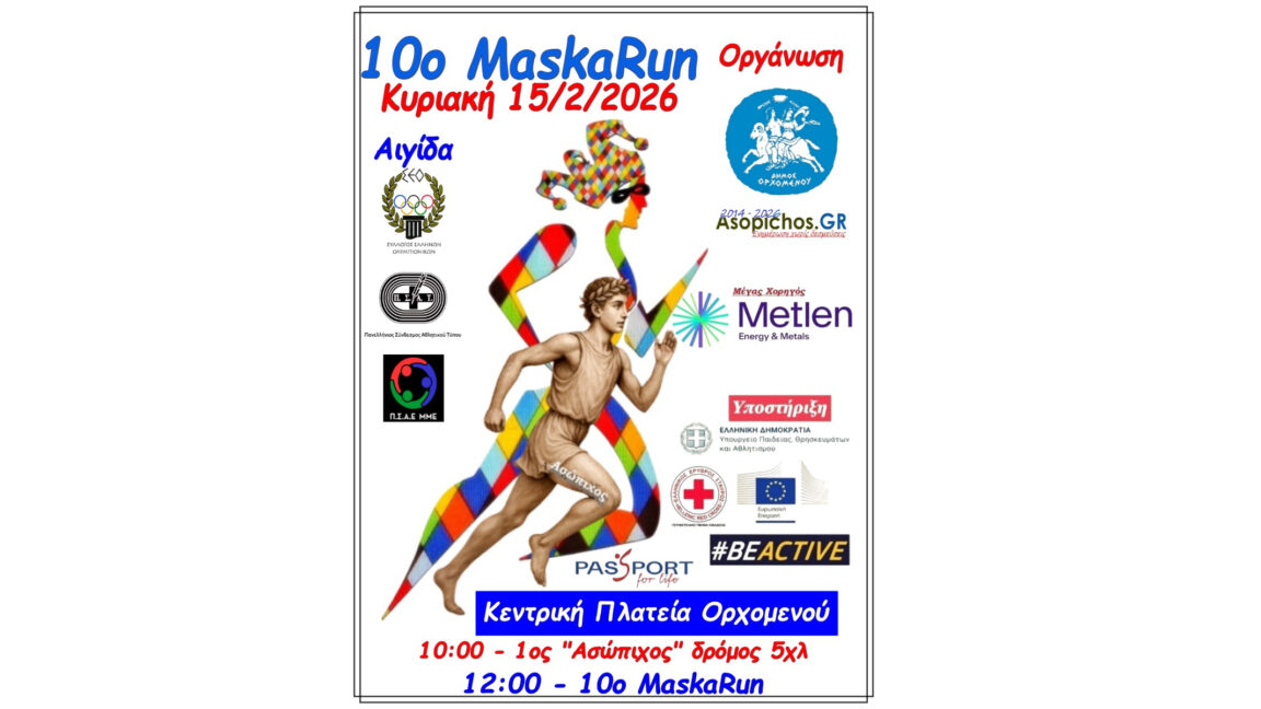 Την Κυριακή 15 Φεβρουαρίου θα διεξαχθούν οι αγώνες: 1ος Αγώνας Δρόμου «Ασώπιχος» & 10ο MaskaRun στον Ορχομενό. Ακολουθεί η προκήρυξη της διοργάνωσης.