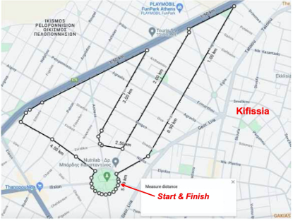Η διαδρομή ξεκινάει από τον δρόμο περιμετρικά της Πλατείας Ηρώων στη συμβολή της με την οδό Αδαμών με αριστερόστροφη φορά. Στρίβουμε δεξιά στην οδό Πλουτάρχου και συνεχίζουμε να κινούμαστε επί της οδού Πλουτάρχου έως τη διασταύρωση της με την οδό Αυγής. Στρίβουμε λοξώς αριστερά επί της οδού Αυγής και συνεχίζουμε να κινούμαστε σε αυτήν. Στη διασταύρωση της οδού Αυγής και του Παράδρομου Α/Δ ΠΑΘΕ στρίβουμε αριστερά και συνεχίζουμε να κινούμαστε επί του παράδρομου. Στη συνέχεια, στη διασταύρωση του Παράδρομου με την οδό Κηφισού, στρίβουμε αριστερά και συνεχίζουμε να κινούμαστε επί της οδού Κηφισού. Στη διασταύρωση της οδού Κηφισού με την οδό Κέκροπος, στρίβουμε δεξιά στην οδό Κέκροπος και συνεχίζουμε ευθεία μέχρι τον κυκλικό κόμβο που συναντά η Κέκροπος. Μπαίνουμε στον κυκλικό κόμβο και παίρνουμε την πρώτη έξοδο, την οδό Ανοίξεως. Συνεχίζουμε για λίγα μέτρα επί της οδού Ανοίξεως και στρίβουμε δεξιά επί του πεζόδρομου στην οδό Πηγών. Συνεχίζουμε ευθεία στην οδό Πηγών έως ότου συναντήσουμε στο τέρμα της τον Παράδρομο Α/Δ ΠΑΘΕ. Στρίβουμε αριστερά στον Παράδρομο Α/Δ ΠΑΘΕ και κινούμαστε σε αυτόν για περίπου 800μ. Στρίβουμε λοξώς αριστερά στην οδό Καπετάν Κορέλα και μετά από λίγα μέτρα, στρίβουμε ξανά αριστερά στην οδό Πάρνηθος. Συνεχίζουμε στην οδό Πάρνηθος μέχρι την Πλατεία Ηρώων Πολυτεχνείου όπου θα είναι και ο τερματισμός.