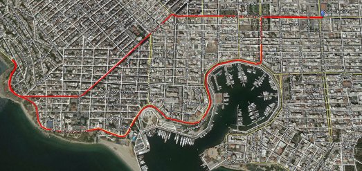 Εκκίνηση μπροστά από το Δημοτικό Θέατρο Πειραιά στην Ηρ. Πολυτεχνείου με κατεύθυνση προς την Λεωφ. Χατζηκυριακού. Στροφή αριστερά στην οδό Σαχτούρη και συνέχεια στην οδό Μητρώου καταλήγοντας στην Ακτή Θεμιστοκλέους με κατεύθυνση την Πειραϊκή, αναστροφή στο ύψος της οδού Ήβης και κατεύθυνση προς την Μαρίνα Ζέας. Συνέχεια στην Ακτή Θεμιστοκλέους , στην Ακτή Μουτσοπούλου και στροφή αριστερά στην οδό Σκουζέ. Τέλος πάλι στροφή δεξιά στην Ηρ. Πολυτεχνείου και τερματισμό μπροστά στο Δημοτικό Θέατρο Πειραιά.
