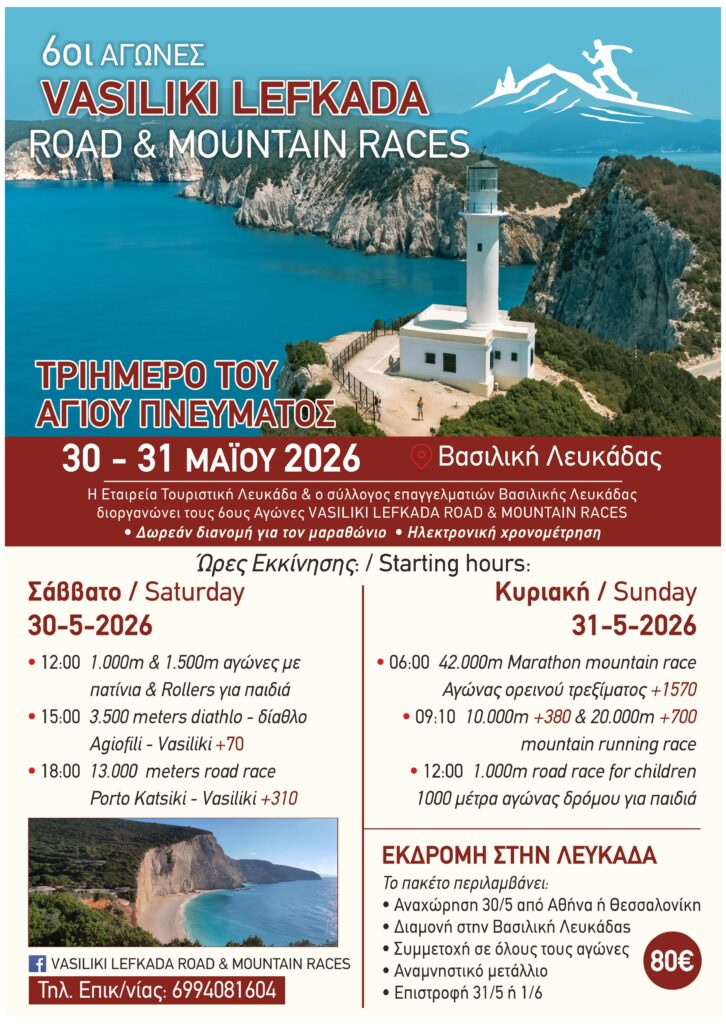 Η Τουριστική Εταιρεία Λευκάδας και ο σύλλογος τουρισμού και πολιτισμού ευρύτερης περιοχής Βασιλικής Λευκάδας προκηρύσσουν τους 6ουs Αγώνες VASILIKI LEFKADA ROAD & MOUNTAIN RACES