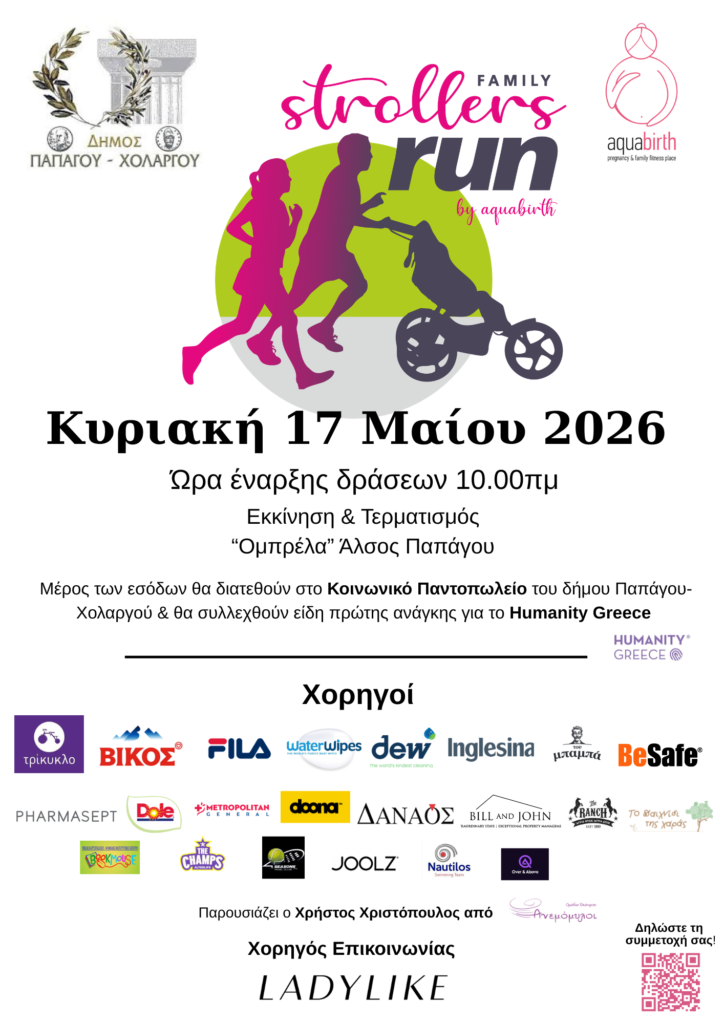 Την Κυριακή 17 Μάιου 2026 και ώρα 10.00π.μ. πραγματοποιείται για 4η  χρονιά στην Ελλάδα, ο πρωτότυπος, μη κερδοσκοπικού χαρακτήρα, αγώνας δρόμου για γονείς με παιδιά 0-4 ετών σε καρότσι, τρίκυκλο, πατίνι, από το Aquabirth, pregnancy and family fitness place, σε συνεργασία με το Δήμο Παπάγου-Χολαργού.