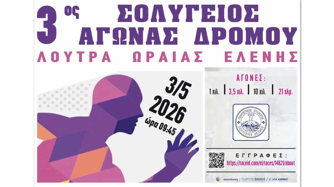 Την Κυριακή 3 Μαΐου θα διεξαχθεί ο 3ος Σολύγειος Αγώνας Δρόμου στα Λουτρά Ωραίας Ελένης. Ακολουθούν οι πληροφορίες της διοργάνωσης.