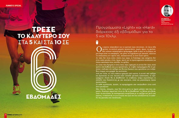 Ξεκινάμε με το κεντρικό θέμα του τεύχους που δεν είναι άλλο από το Runner’s Special. Αν είσαι κι εσύ σε αυτούς που θέλουν να συμμετάσχουν ή έχουν ήδη κανονίσει να αγωνιστούν στους αγώνες των 5 και 10χλμ. και δεν έχεις ξεκινήσει ακόμα την προετοιμασία σου, ήρθε η ώρα να το κάνεις. Ακόμα και αν έχεις ξεκινήσει, όμως, σίγουρα θα πρέπει να βάλεις τις προπονήσεις σου σε μία σειρά. Γι’ αυτό, λοιπόν, σου παρουσιάζουμε προγράμματα έξι εβδομάδων για τα 5 και τα 10χλμ. Δύο επιλογές, Light και Hard, για εντελώς πρωτάρηδες ή λίγο πιο έμπειρους, αλλά και τους προχωρημένους που έχουν υψηλούς στόχους!