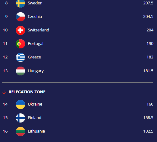 Συγκεκριμένα, η χώρα μας έχει συγκεντρώσει 182 βαθμούς που την φέρνουν στην 12η θέση, μόλις όμως, μισό πάνω από την 13η αλλά και 22 από τη ζώνη του υποβιβασμού.