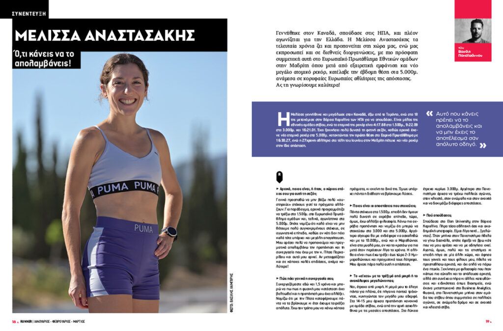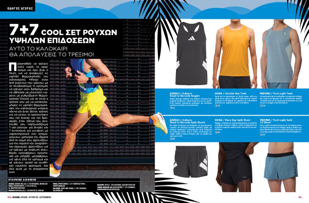 Δοκιμάζουμε και σου παρουσιάζουμε έξι hot δρομικά μοντέλα (Adidas Adizero EVO SL, Hoka Clifton 10, Mizuno Neo Vista 2, On CLoudboom Strike, Salomon Aero Glide 3, GRVL και Saucony Guide 18) που… καίγονται για χιλιόμετρα, μαθαίνουμε τα κορυφαία νέα από τον κόσμο και την Ελλάδα, ενώ γνωρίζουμε καλύτερα την πρωταθλήτρια των αποστάσεων Μελίσσα Αναστασάκης, την αθλήτρια που κοσμεί το εξώφυλλό μας, μέσα απ’ τη συνέντευξη που μας παραχώρησε.