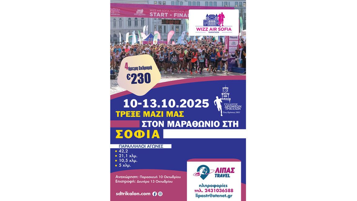 Ο Σύλλογος Δρομέων Τρικάλων, σε συνεργασία με το ταξιδιωτικό γραφείο Lipas Travel, σας προσκαλεί σε μια μοναδική 4ήμερη αθλητική και πολιτιστική εμπειρία στη Σόφια της Βουλγαρίας, με αφορμή τον Διεθνή Μαραθώνιο της Σόφιας!