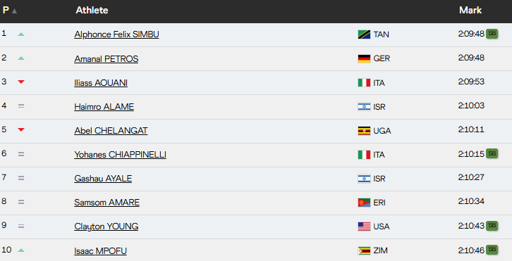 Στο 40ο χλμ. έξι δρομείς είχαν μείνει στην κορυφή (οι Iταλοί Aouani και Chiappinelli o Abel Chelangat, o Amanal Petros, o Haimro Alame, και ο Simbu) με το 5άρι αυτό να πηγαίνει σε 16:17 και τελικά όλα κρίθηκαν στα τελευταία μέτρα με τον Amanal Petros να ξεφεύγει και να μπαίνει πρώτος στο Στάδιο και τελικά να χάνει το χρυσό ακριβώς στον τερματισμό.
