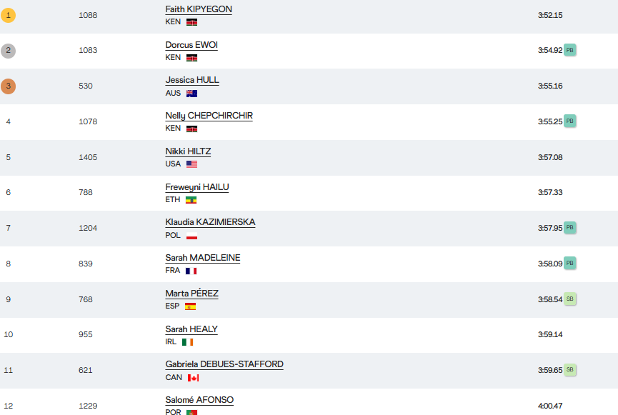 Ο χρόνος της τελικά ήταν 3:52.15 με την 31χρονη σούπερσταρ των μεσαίων αποστάσεων να φτάνει τα πέντε χρυσά σε Παγκόσμια πρωταθλήματα (2017 Λονδίνο, 2022 Όρεγκον, 2023 Βουδαπέστη σε 1.500 και 5.000μ.), ενώ έχει και δύο ασημένια στο Πεκίνο το 2015 και στην Ντόχα το 2019.