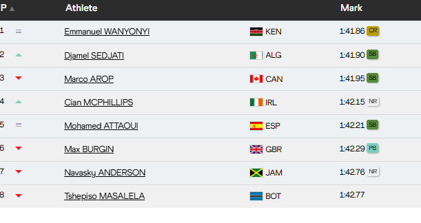 Ο Αλγερινός Sedjati ανέβηκε στο τέλος και έκλεψε το ασημένιο με 1:41.90 από τον Arop που φάνηκε ότι θα πάρει το χρυσό μπαίνοντας στην τελική ευθεία, αλλά τελικά έμεινε τρίτος με 1:41.91.