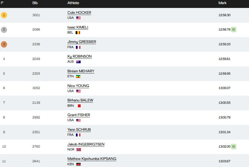 Δεύτερος ήταν ο Βέλγος Isaac Kimeli (12:58.78) που έτρεξε κι αυτός έξυπνα κι ανέβηκε στα τελευταία 500μ., ενώ ο Jimmy Gressier (12:59.33), κι αυτός πολύ δυνατός στο τέλος, πήρε ένα ακόμα μετάλλιο στη διοργάνωση κατακτώντας το χάλκινο.