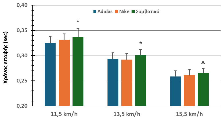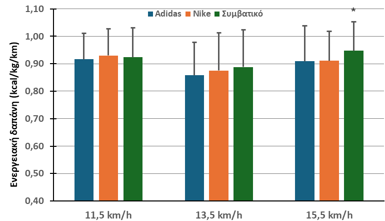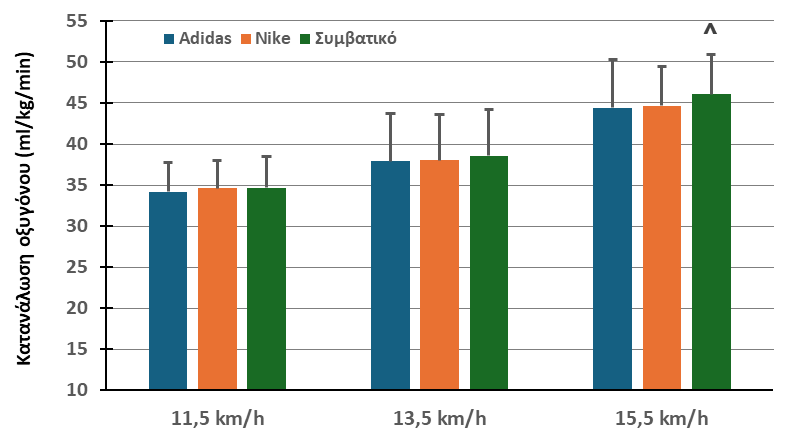 Η ανάλυση των δεδομένων έδειξε ότι στην ταχύτητα 15,5 χλμ/ώρα υπήρχε υψηλότερη κατανάλωση οξυγόνου με το συμβατικό παπούτσι, συγκριτικά με το Adidas, ενώ στην ίδια ταχύτητα το θερμιδικό κόστος με τα 2 υπέρ-παπούτσια ήταν μειωμένo σε σύγκριση με το συμβατικό. Ο χρόνος επαφής με το έδαφος, τρέχοντας με το συμβατικό παπούτσι, ήταν μεγαλύτερος συγκριτικά με το Adidas και το Nike και στις τρείς ταχύτητες.