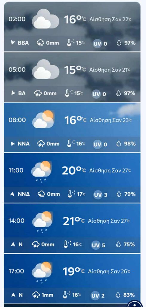Γύρω στις 07:00: οι θερμοκρασίες θα είναι περίπου 16 °C, με κατά πλειοψηφία πολλή συννεφιά.