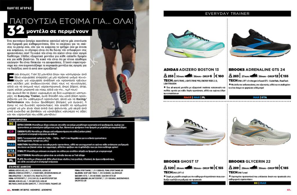 Ο κεντρικός Οδηγός Αγοράς του τεύχους είναι αφιερωμένος στο σημαντικότερο εργαλείο ενός δρομέα, τα παπούτσια! Στις σελίδες του θα βρεις συγκεντρωμένα 32 κορυφαία μοντέλα της αγοράς με όλα τα στοιχεία εκείνα που χρειάζεσαι για να επιλέξεις το κατάλληλο για σένα. Ένα θέμα που σίγουρα θα δεχτεί… σημειώσεις!