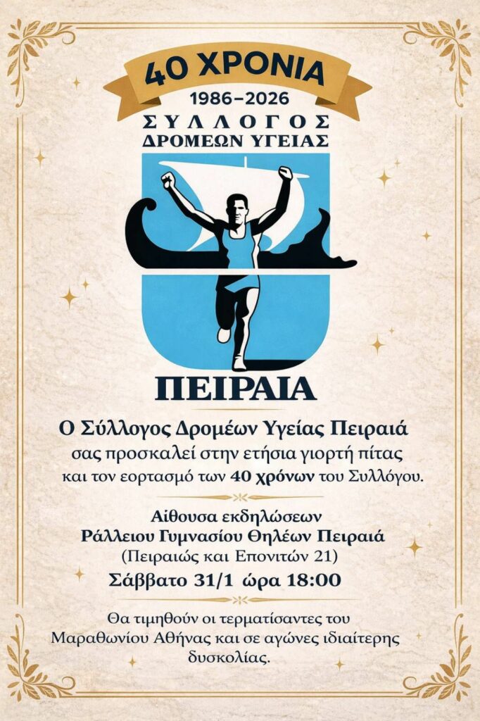 “Το Δ.Σ. του Σ.Δ.Υ.Π. σας προσκαλεί στην ετήσια κοπή της πίτας του συλλόγου και την επετειακή γιορτή, με την ευκαιρία της συμπλήρωσης 40 χρόνων από την ίδρυση του,το Σάββατο 31 Ιανουαρίου 2026 στις 18.00 στο θέατρο του Ραλλείου Γυμνασίου ( Πειραιώς και Επονιτών 21 ).