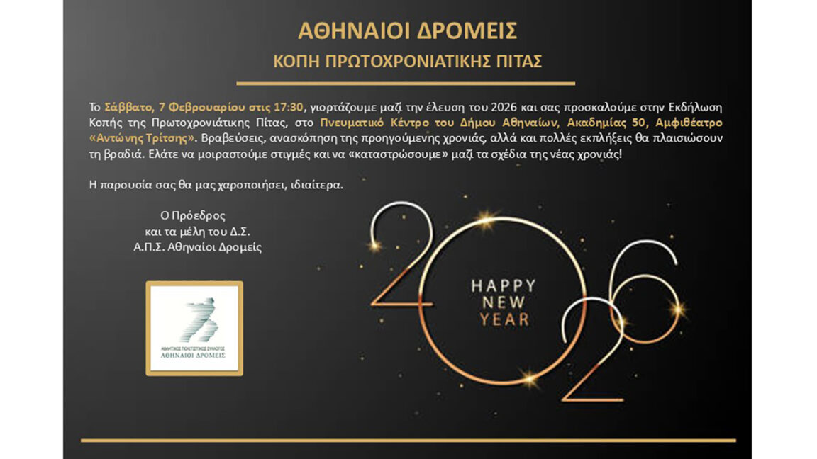 Ο ΑΠΣ Αθηναίοι Δρομείς θα πραγματοποιήσει την Κοπή της Πρωτοχρονιάτικης Πίτας του, το Σάββατο, 7 Φεβρουαρίου, στις 17:30, στο Πνευματικό Κέντρο του Δήμου Αθηναίων, Αμφιθέατρο «Αντώνης Τρίτσης», Ακαδημίας 50, Αθήνα.