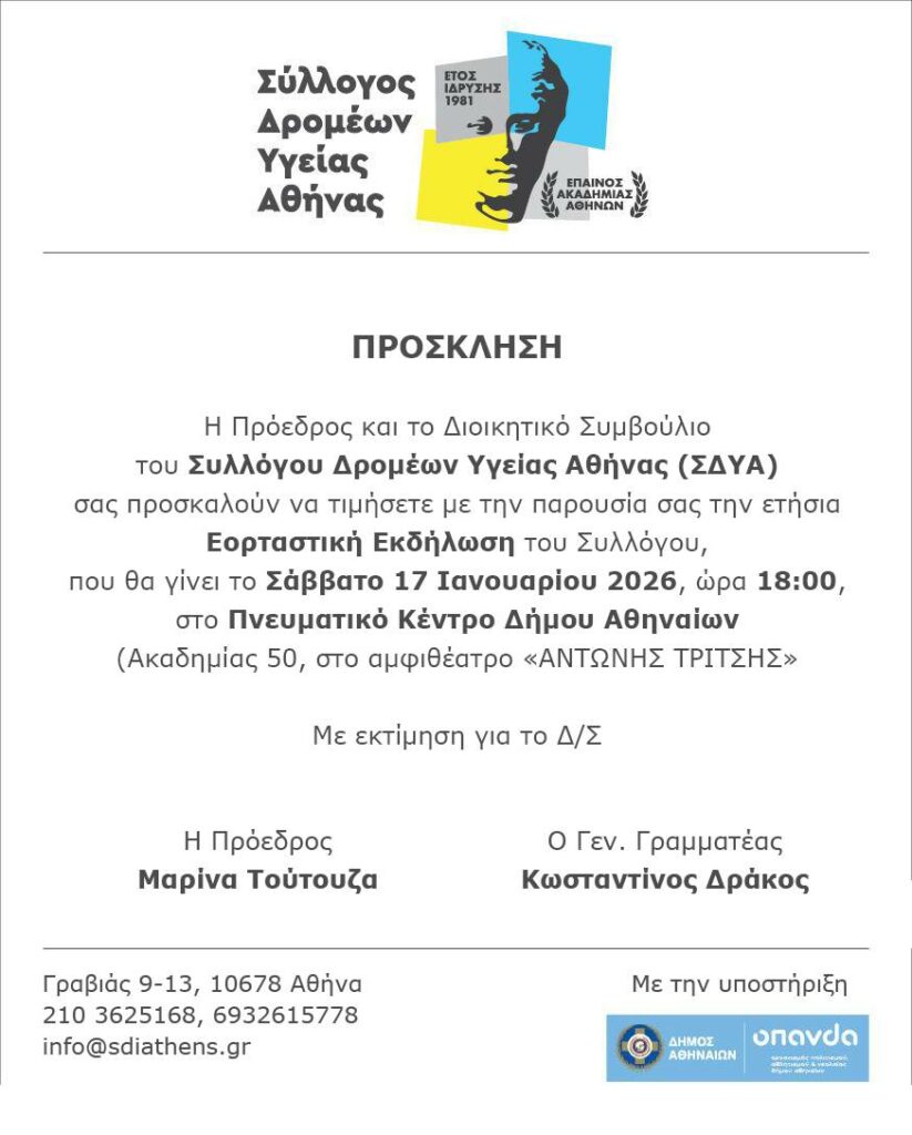 O Σύλλογος Δρομέων Υγείας Αθήνας (ΣΔΥΑ) ενημερώνει τα μέλη και τους φίλους του για την εορταστική εκδήλωση και την κοπή της Πρωτοχρονιάτικης Πίτας του που θα πραγματοποιήσει το Σάββατο 17 Ιανουαρίου στις 18:00 στο Πνευματικό Κέντρο του Δήμου Αθηναίων (Ακαδημίας 50, αμφιθέατρο «Αντώνης Τρίτσης»)