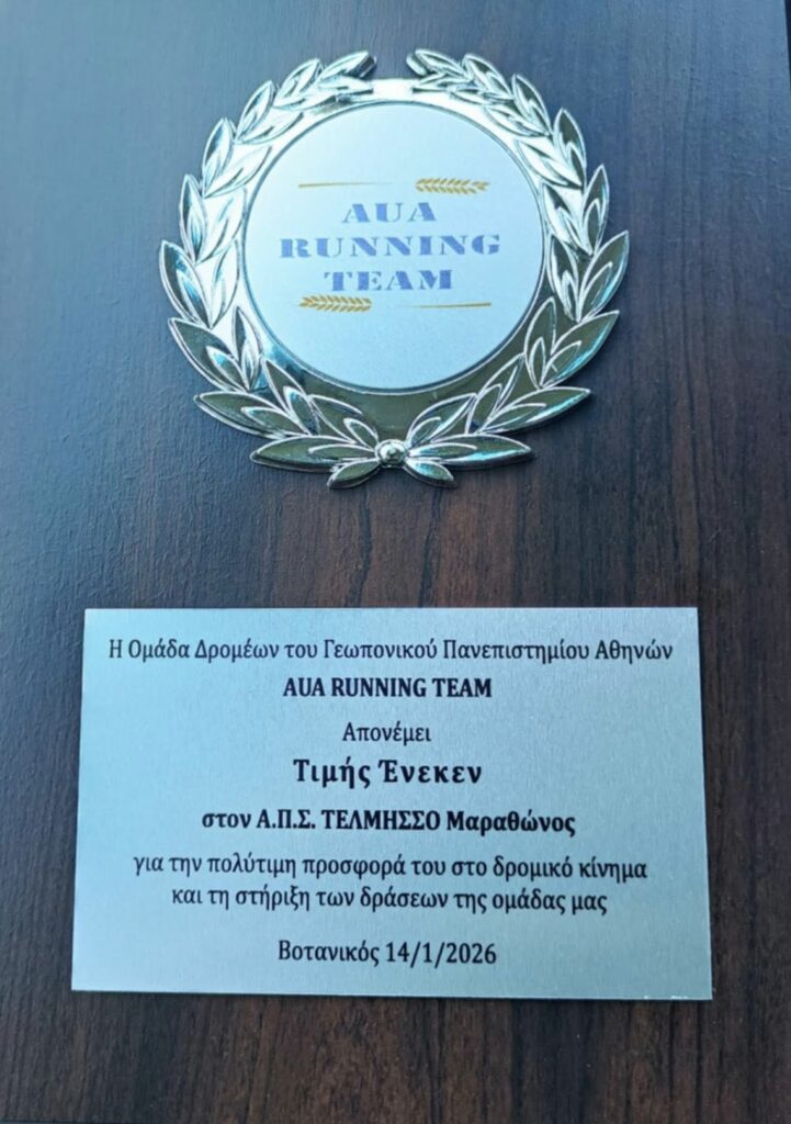 Η καθηγήτρια φυσικής αγωγής Ξένια Τσιαλαγκού εκπρόσωπος της AUA Running Team απένειμε στον πρόεδρο του Τελμησσού Βλάση Καραβασίλη τιμητική πλακέτα για την πολύτιμη προσφορά του συλλόγου μας στο δρομικό κίνημα και στη στήριξη των δράσεων της ομάδας τους.