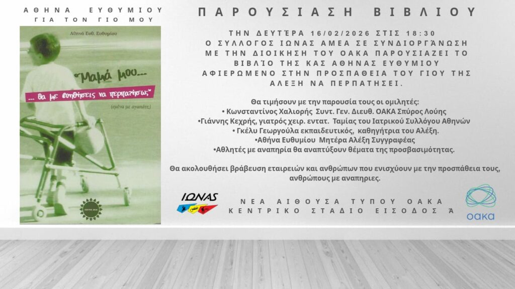 Ο Σύλλογος Ιωνάς ΑμεΑ, σε συνδιοργάνωση με τη Διοίκηση του ΟΑΚΑ, παρουσιάζει το βιβλίο της κας Αθηνάς Ευθυμίου, αφιερωμένο στην προσπάθεια του γιου της, Αλέξη, να περπατήσει.