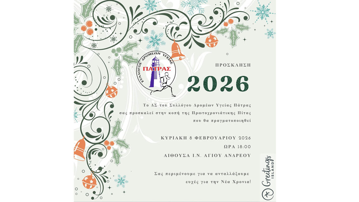 «Σας προσκαλούμε στην εκδήλωση κοπής της Πρωτοχρονιάτικης πίτας του ΣΔΥ ΠΑΤΡΩΝ Σύλλογος Δρομέων Υγείας Πάτρας που θα πραγματοποιηθεί την ΚΥΡΙΑΚΗ 8 ΦΕΒΡΟΥΑΡΙΟΥ στις 6μ.μ. στην αίθουσα του Πνευματικού Κέντρου του Ιερού Ναού Αγ.Ανδρεα Πατρών.