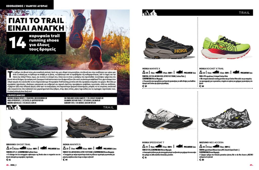Και επειδή είμαστε σίγουροι ότι όταν διαβάσεις το παραπάνω άρθρο θα θέλεις να το κάνεις πράξη εμείς φροντίζουμε να σε ενημερώνουμε και για τα κατάλληλα… εργαλεία. Στο οδηγό αγοράς του τεύχους σου παρουσιάζουμε 14 κορυφαία μοντέλα trail running για να επιλέξεις ανάλογα με τις ανάγκες σου και τους στόχους σου.