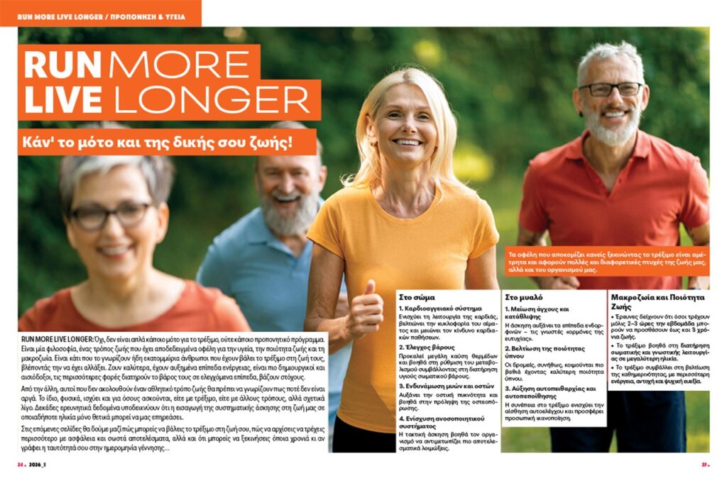 Το «Run more, live longer» πρωταγωνιστεί στο κεντρικό μας αφιέρωμα. Και δεν πρόκειται μόνο για μία φράση, αλλά μία φιλοσοφία, έναν τρόπος ζωής, με αποδεδειγμένα οφέλη για την υγεία, την ποιότητα ζωής και τη μακροζωία. Πώς θα βάλεις και εσύ το τρέξιμο στη ζωή σου; Πώς θα καταφέρεις να τρέχεις περισσότερο; Πώς θα ξεκινήσεις ανεξάρτητα με την ηλικία σου; Όλες οι απαντήσεις το πολύσέλιδο θέμα μας.