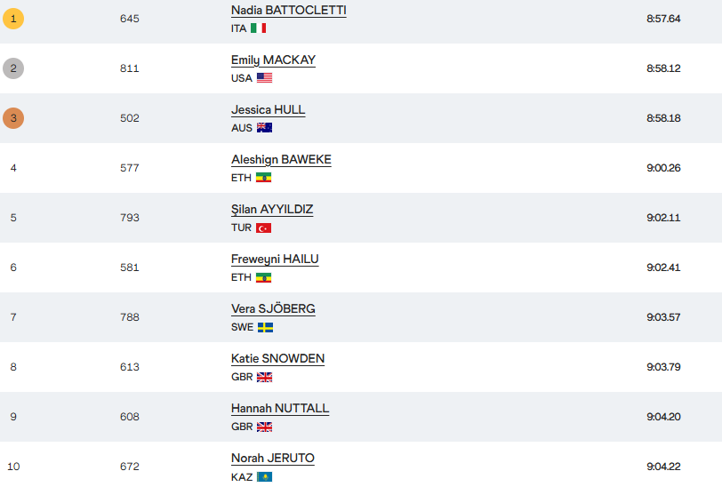 Στις γυναίκες, λοιπόν, μετά από μία κούρσα τακτικής που οδήγησε για μεγάλο διάστημα η Nadia Battocletti σε σχετικά αργούς ρυθμούς, η Ιταλίδα άντεξε την επίθεση της Αυστραλής Jessica Hull και έφτασε στο πρώτο της χρυσό σε Παγκόσμιο πρωτάθλημα κλειστού με επίδοση 8:57.64.