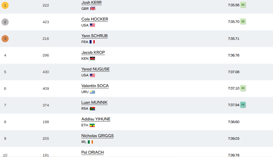 Δυνατός ήταν στο τέλος, όπως πάντα άλλωστε, ο Cole Hocker που τερμάτισε δεύτερος αλλά δεν πρόλαβε να κοντράρει τον Σκωτσέζο. Τρίτος ήταν ο Γάλλος Yann Schrub που ήταν κι αυτός κινήθηκε έξυπνα όσο και δυνατά τέλος και “κόλλησε” με τον Kerr στις αλλαγές, αλλά έχασε στην τελική ευθεία το ασημένιο από τον Hocker.