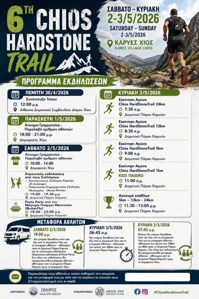 Η διοργάνωση του Chios Hardstone Trail 2026 ενημερώνει τους συμμετέχοντες για τις ώρες προσέλευσης στις δράσεις και τους αγώνες. Ακολουθεί η ανακοίνωση.