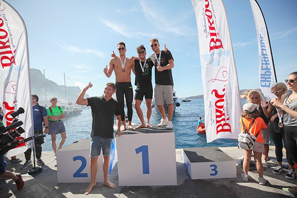 Οι τρεις πρώτοι κολυμβήτριες στον αγώνα κολύμβησης open water by Vikos με τον αργυρό Ολυμπιονίκη Σπύρο Γιαννιώτη (photo by Danijela Bogdanovic)