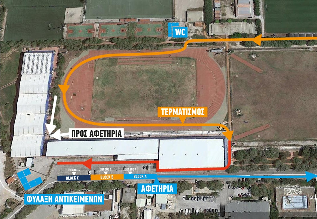 Μετά τον τερματισμό σας σας παρακαλούμε να ακολουθήσετε την κόκκινη γραμμή για να οδηγηθείτε στον χώρο φύλαξης προσωπικών αντικειμένων και στη συνέχεια εντός του σταδίου για να παρακολουθήσετε τη συνέχεια του αγώνα και την τελετή των απονομών.