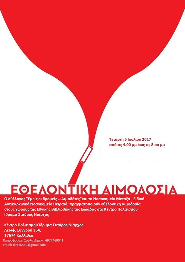 Ο σύλλογος «Εμείς οι δρομείς… Αιμοδότες» και το Νοσοκομείο Μεταξά – Ειδικό Αντικαρκινικό Νοσοκομείο Πειραιά, διοργανώνουν εθελοντική αιμοδοσία την Τετάρτη 5 Ιουλίου στο Κέντρο Πολιτισμού Ίδρυμα Σταύρος Νιάρχος.