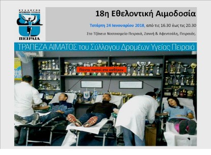 Η αιμοδοσία μας ενηλικιώθηκε, κλείνει τα δεκαοχτώ της και σας προσκαλεί όλους, την Τετάρτη στις 24 Ιανουαρίου 2018 στο Τζάνειο Νοσοκομείο ( όχι στα γραφεία του συλλόγου). Από τις 4 το απόγευμα μέχρι τις 8. θα είμαστε όλοι  εκεί και θα σας περιμένουμε να βάλουμε μια κόκκινη πινελιά στο έργο του συλλόγου μας.