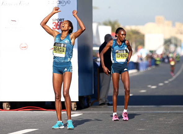 Πραγματοποίησαν μία εντυπωσιακή κούρσα στον Standard Chartered Dubai Marathon δίνοντας μάχη σώμα με σώμα και πετυχαίνοντας πραγματικά εντυπωσιακές επιδόσεις. Επειδή, όμως, αυτό που μετράει για τους δρομείς αυτού του επιπέδου είναι η νίκη, αυτή που βρέθηκε στους επτά ουρανούς πανηγυρίζοντας δεόντως ήταν η Ασελέφεχ Μέργκια με τη Λίζα Κιπρόνο που έμεινε ένα μόλις δευτερόλεπτο πίσω να προδίδει την απογοήτευσή της.