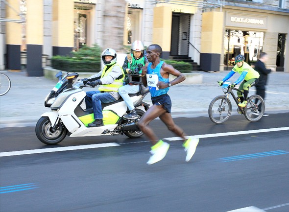 Δεν είναι πάντα εύκολο να αντιληφθεί κανείς τι πραγματικά σημαίνει να τρέχει κανείς για 42,2 χλμ. σε ρυθμό κάτω από τα 3’ ανά 1.000 μ.! Ακόμα και δρομείς με εμπειρία, οι οποίοι κινούνται σε πιο αργούς ρυθμούς στις προπονήσεις και τους αγώνες τους, ίσως να μην μπορούν να καταλάβουν τις συγκεκριμένες εντάσεις. Στη φωτογραφία, αποτυπώνεται ως ένα σημείο τόσο το μέγεθος της προσπάθειας όσο και η ταχύτητα του Έλιουντ Κιπτσόγκε στα τελευταία χιλιόμετρα του BMW Berlin Marathon που σε αυτή τη φάση ξεπερνά τα 20 χλμ./ώρα!