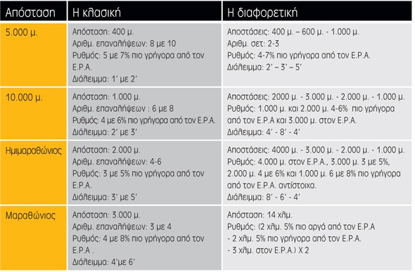 Προπονήσεις τις οποίες αν κάποιος εκτελέσει στο σωστό ρυθμό μπορούν να τον κάνουν πιο γρήγορο και να τον οδηγήσουν στην επίτευξη ενός νέου ρεκόρ. Στον πίνακα που ακολουθεί σας παρουσιάζουμε για κάθε μία από τις τυπικές αποστάσεις των δρομικών αγωνισμάτων αντοχής δύο ειδών προπονήσεις. Η πρώτη, η «κλασική», είναι αυτή που συναντάμε στα περισσότερα προπονητικά προγράμματα. Η δεύτερη αποτελεί μία πιο «διαφορετική» πρόταση για όσους θέλουν να ξεφύγουν από τα συνηθισμένα.
