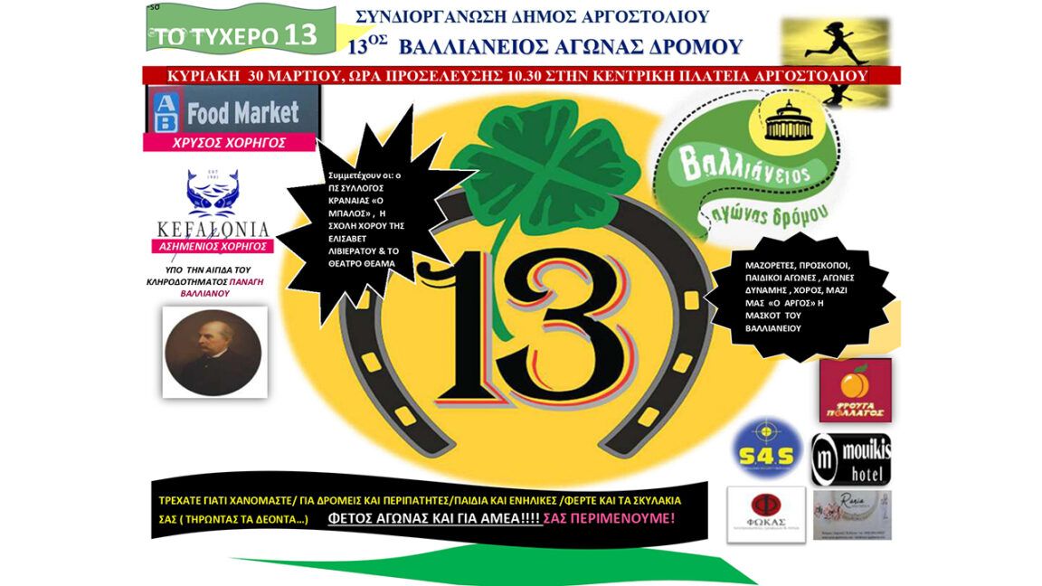 Την Κυριακή 30 Μαρτίου θα διεξαχθεί ο 13οs Βαλλιάνειος στο Αργοστόλι. Ακολουθεί η προκήρυξη της διοργάνωσης.