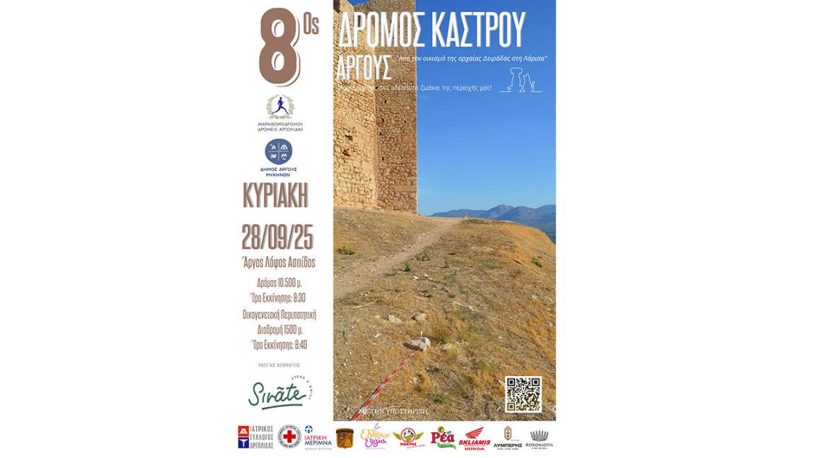 Ο Σύλλογος Μαραθωνοδρόμων & Δρομέων Αργολίδας (μέλος Ε.Ο.Σ.Λ.Μ.Α-Υ) διοργανώνει τον 8ο Δρόμο Κάστρου Άργους «Από τον οικισμό της αρχαίας Δειράδας στη Λάρισα», έναν δρομικό ύμνο στο Άργος – την αρχαιότερη συνεχώς κατοικημένη πόλη της Ευρώπης, με 7.000 χρόνια αδιάλειπτης ζωής και πολιτισμού.