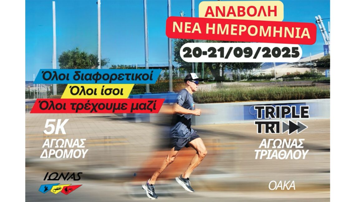 Η νέα ημερομηνία είναι Σάββατο 20/9 Αγώνας Δρόμου 5χλμ & Κυριακή 21/9 Triple Tri.