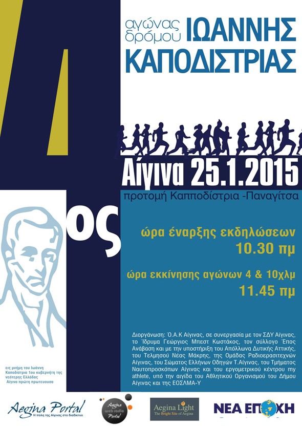 «Ο Ο.Α.Κ Αίγινας σε συνεργασία με, τον ΣΔΥ Αίγινας, το Ίδρυμα Γεώργιος Μπεστ Κωστάκος, τον σύλλογο Έπος Ανάβαση και με την υποστήριξη του Απόλλωνα Δυτικής Αττικής, του Τελμησού Νέας Μάκρης, της Ομάδας Ραδιοερασιτεχνών Αίγινας, του Σώματος Ελλήνων Οδηγών Τ.Αίγινας, του Τμήματος Ναυτοπροσκόπων Αίγινας και του εργομετρικού κέντρου my athlete (www.myathlete.gr), υπό την αιγίδα του Αθλητικού Οργανισμού του Δήμου Αίγινας και της ΕΟΣΛΜΑ-Υ, διοργανώνει τον 4ο αγώνα με την επωνυμία «ΙΩΑΝΝΗΣ ΚΑΠΟΔΙΣΤΡΙΑΣ 2015» στην πόλη της Αίγινας.