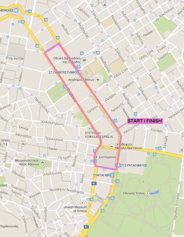 Εκκίνηση (City Link) – Πανεπιστημίου (αριστερά)- Πεσματζόγλου (αριστερά)- Σταδίου (αριστερά) – Φιλελλήνων – Λ. Αμαλίας- Πανεπιστημίου – Τερματισμός (City Link)