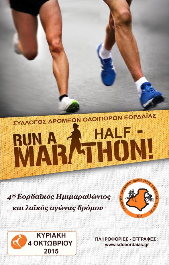 Ο Σύλλογος Δρομέων Οδοιπόρων Εορδαίας με τη συνεργασία του Δήμου Εορδαίας, της Περιφέρειας Δυτικής Μακεδονίας, με τοπικούς, πολιτιστικούς, αθλητικούς και άλλους φορείς, υπό την αιγίδα της ΕΟΣΛΜΑ-Υ (Ελληνικής Ομοσπονδίας Συλλόγων Λαϊκού Μαζικού Αθλητισμού και Υπεραποστάσεων), προκηρύσσει τη διοργάνωση του 4ου Εορδαικού ημιμαραθωνίου δρόμου, καθώς επίσης και μαζικού λαϊκού αγώνα δρόμου 8.000 μέτρων, την Κυριακή 04 Οκτωβρίου 2015.
