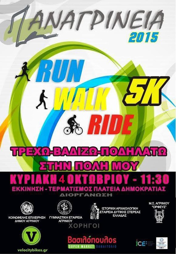 «Στο πλαίσιο των εκδηλώσεων των Παναγρινείων, η Κοινωφελής Επιχείρηση του Δήμου Αγρινίου (Κ.Ε.Δ.Α.), η Γυμναστική Εταιρεία Αγρινίου (Γ.Ε.Α.), η Ιστορική & Αρχαιολογική Εταιρεία Δυτικής Στερεάς Ελλάδας και ο Μουσικός Σύλλογος Αγρινίου «ΟΡΦΕΥΣ» συνδιοργανώνουν Λαϊκό Αγώνα Δρόμου και Ποδηλασίας, με την ονομασία «Τρέχω-Βαδίζω-Ποδηλατώ στους δρόμους της πόλης μου», την Κυριακή 4 Οκτωβρίου 2015 στην κεντρική πλατεία Αγρινίου (πλατεία Δημοκρατίας) και ώρα 11:30.