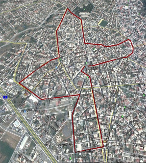 Αφετηρία και τερματισμός θα είναι η κεντρική πλατεία του Αγρινίου (Πλατεία Δημοκρατίας). Η διαδρομή θα διασχίζει την οδό Μπαϊμπά, μετά την πλατεία Καραπανέϊκα στρίβει αριστερά στις οδούς Παναγοπούλου και Θεοτοκοπούλου, στην εκκλησία του Αγίου Χριστοφόρου στρίβει αριστερά στην οδό Αγίου Χριστοφόρου, συνεχίζει στην οδό Δημοτσελίου και στρίβει δεξιά στην οδό Παπαστράτου. Στο τέλος της οδού Παπαστράτου στρίβει αριστερά στην οδό Ελ. Βενιζέλου και πάλι αριστερά στην οδό Ηρώων Πολυτεχνείου. Στο ύψος της πλατείας Χατζοπούλου στρίβει δεξιά στην οδό Καλυβίων. Στο τέλος αυτής της οδού στρίβει αριστερά στην οδό Τερτσέτη, μπροστά από τα Δικαστήρια, και συνεχίζει στην οδό Μαβίλη. Στο τέρμα στρίβει δεξιά στην οδό Δεληγεώργη και μετά στην οδό Καλλέργη και στο ύψος της οδού Οινέως (κάθετη της οδού Καλλέργη) στρίβει αριστερά όπου συναντά την οδό Χαριλάου Τρικούπη. Ακολουθεί όλη την οδό μέχρι το ύψος του Δημαρχείου όπου στρίβει αριστερά στην οδό Βότση και δεξιά στην οδό Αναστασιάδη και τερματίζει στην κεντρική πλατεία. Το μήκος της διαδρομής είναι 5000μ.».