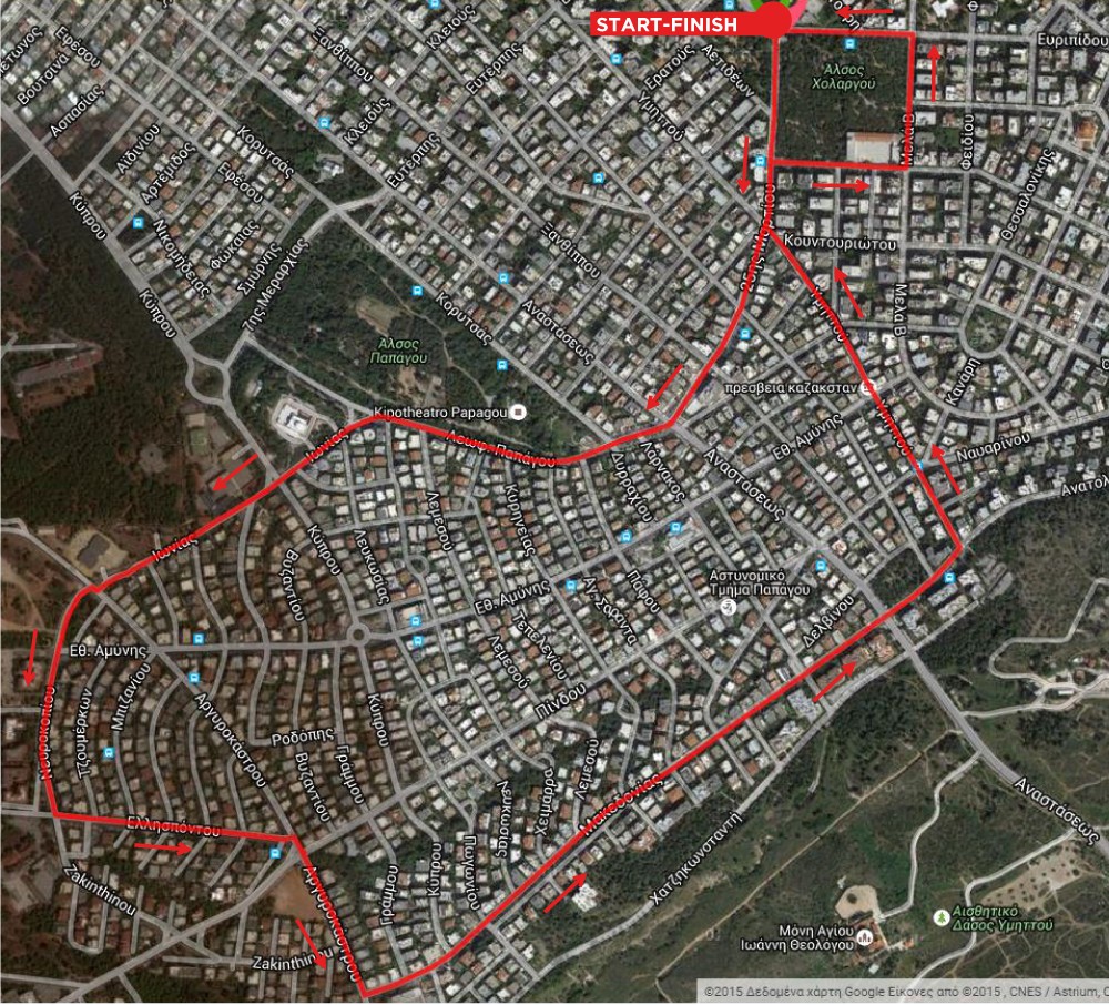 5.000 χλμ.: 25ης Μαρτίου – Λεωφ. Παπάγου – Ιωνίας – Νευροκοπίου – Ελλησπόντου – Αργυροκάστρου – Μακεδονίας – Ανατολής – Υμηττού – 25ης Μαρτίου – Καραϊσκάκη – Β. Μελά – Ευριπίδου.