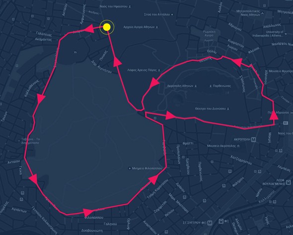 Στροφή αριστερά στην οδό Φρυνίχου και συνέχεια στις οδούς Λυσικράτους, Σέλλεϋ και Τριπόδων. Στροφή αριστερά στην οδό Πρυτανείου και συνέχεια στην οδό Θεωρίας όπου στο τέλος στρίβουμε δεξιά προς την στην οδό Διονυσίου Αρεοπαγίτου και τερματισμό στο ίδιο σημείο με την εκκίνηση.